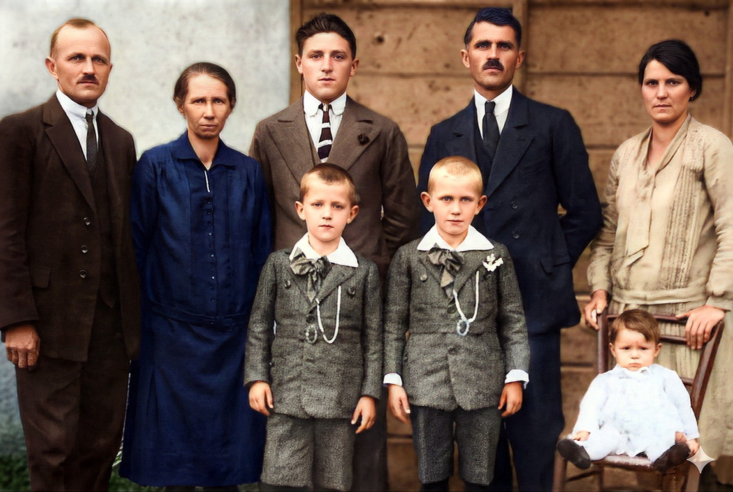Jakin family photo (colorised), taken about mid-1930. On the far right is Livia, with baby Danila. Next to her are two brothers of her husband, Rudolf—Stanislav in the dark suit and Carlo in the lighter suit. Both Stanislav and Karol followed Rudolf to Argentina shortly after this photo was taken.