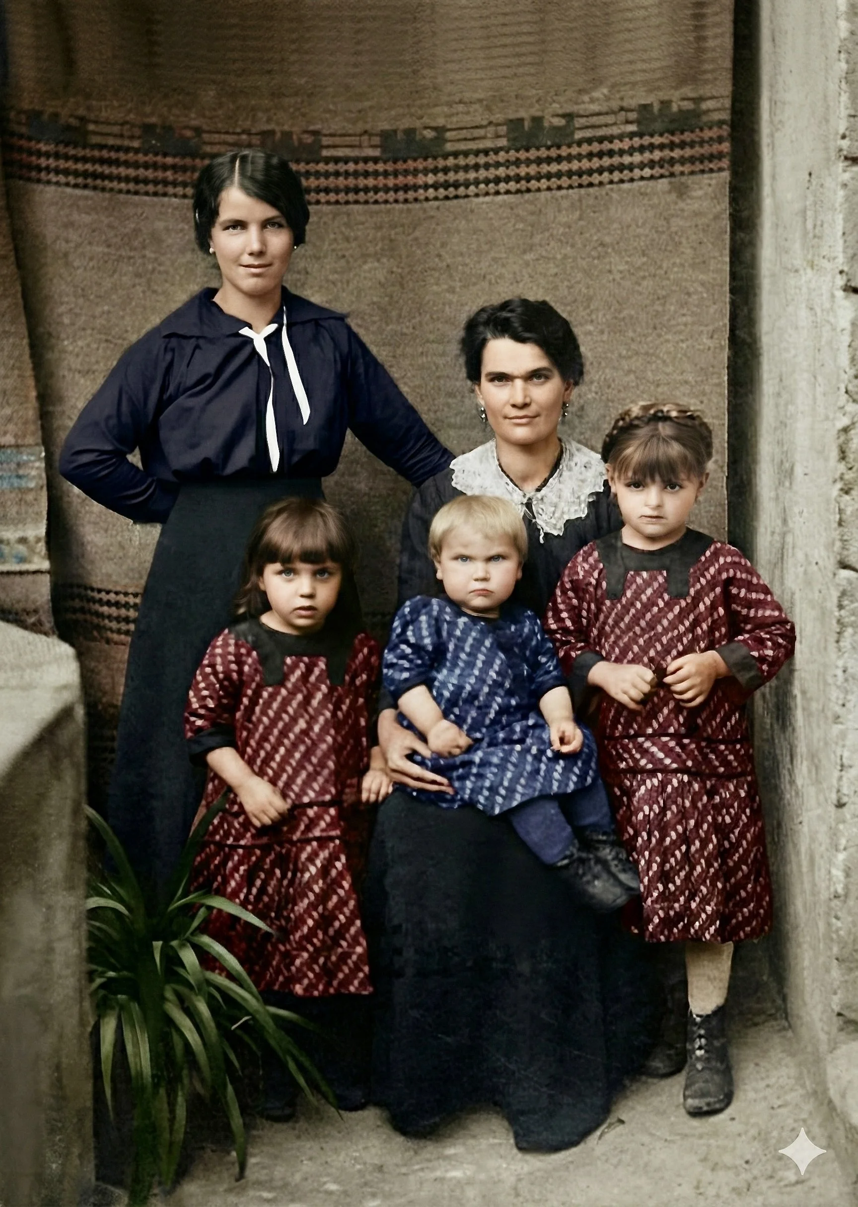 Mavrič family taken about 1917, probably in Caserta, near Naples. Standing is Kristina's younger sister, Giselle. In front (L to R) are daughter, Kristina ("Tine"), son Bogomir jnr (on Kristina's lap) and oldest daughter Ernesta. Bogomir died during the Spanish Flu epidemic Photo colourised.